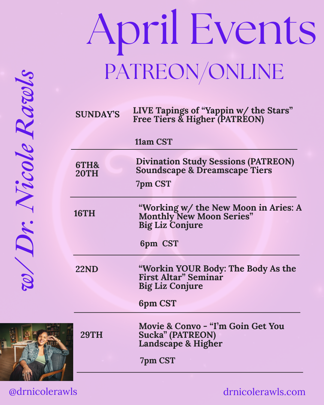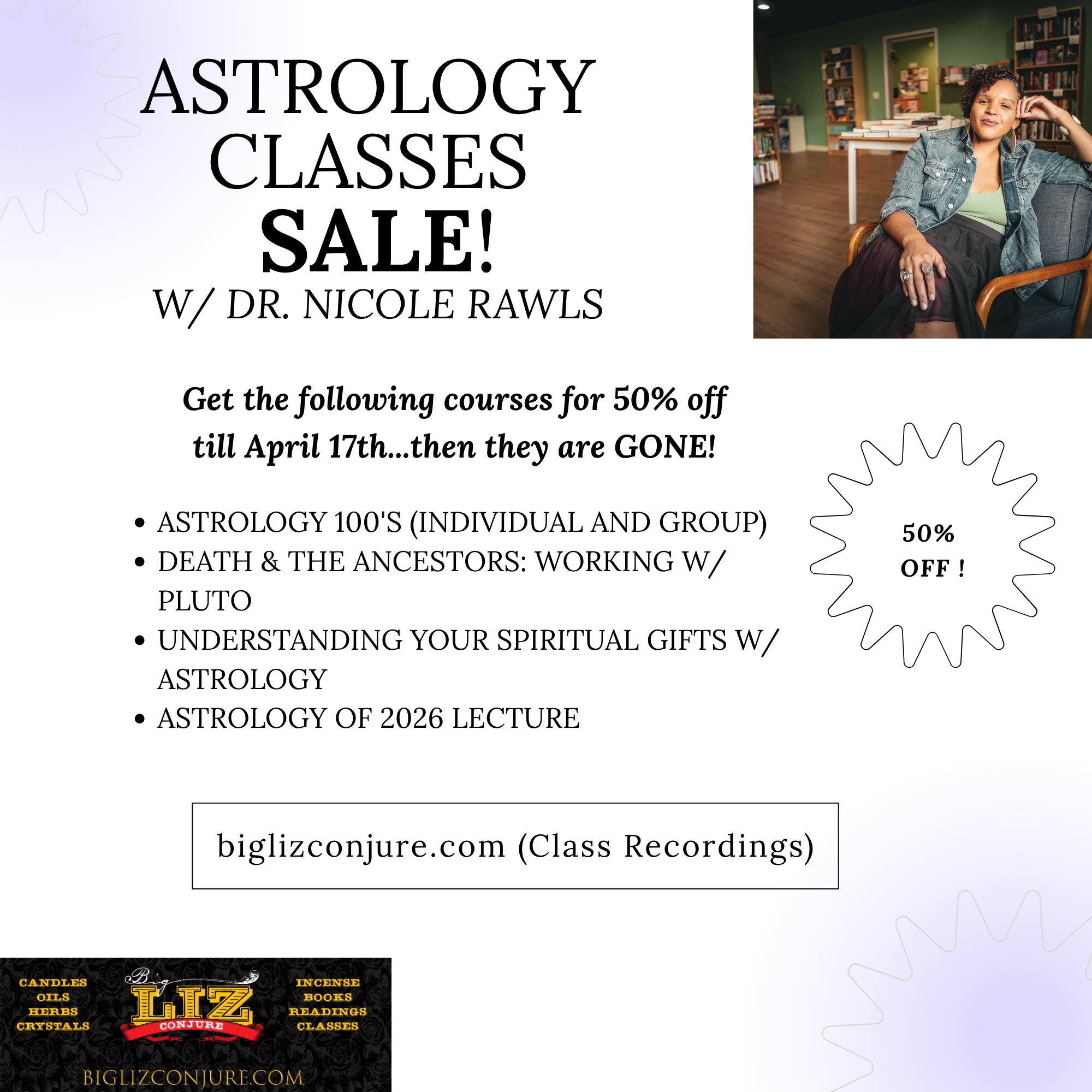This month we have a thick stellium (multiple planets) in the fire sign of Aries. I have a number of different online events via my Patreon and classes through Big Liz Conjure to help work with and navigate these energies.
